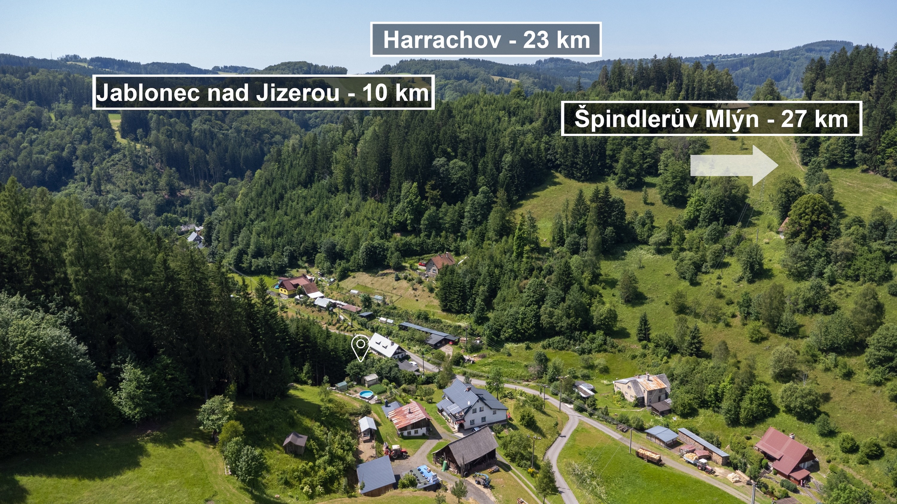 Lokalita je ideální pro milovníky přírody, klidu a rekreace. Pozemek je z jedné strany lemován horským potůčkem a z druhé strany obklopen přímo navazujícím lesem. V okolí se nachází spousta turistických a cyklistických tras, které vedou krásnou krajinou Krkonošského podhůří. V zimě oceníte blízkost lyžařských středisek – do 15 minut jízdy se dostanete do Ski areálu Rokytnice nad Jizerou nebo Vítkovice – Aldrov.Dopravní dostupnost